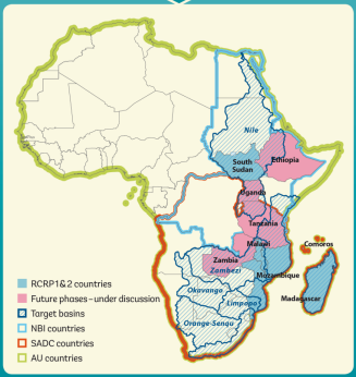 Nile Basin Initiative (NBI) is a partnership of the 10 Nile Basin riparian states with a shared vision objective to promote sustainable socio-economic development through the equitable utilization of and benefit from the shared Nile Basin water resources. The World Bank International Development Association (IDA) has financed the Nile Basin Initiative (NBI) centers through the Eastern Nile Technical Regional Office (ENTRO) and the Nile Equatorial Lakes Subsidiary Action Program Coordination Unit (NELSAP-CU), to implement Phase 1 of the Regional Climate Resilience Program (RCRP) for Eastern and Southern Africa, a program envisioned as a regional multi-phase engagement Series of Projects (SOP). The Program Development Objective (PDO) is to improve the management of water-related climate impacts, with the higher-level aim of strengthening the resilience of populations to climate-related shocks. The target countries are Comoros, Madagascar, Malawi, Mozambique, and South Sudan with the assistance of regional organizations, namely the African Union (AU), Southern Africa Development Community (SADC), and NBI.