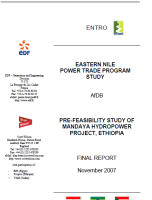 Pre-Feasibility Study Report of the potential hydropower project at the Mandaya site in Ethiopia, carried out as part of Module 5 (Pre-Feasibility Studies of Three Proposed Hydropower Project Sites) of Phase I of the Eastern Nile Power Trade Program Study, implemented by ENTRO from 2006 – 2008. The main topics considered include: a review of previous studies, general hydrology, flood studies, sediment analysis, reservoir and power simulation (using RAPSO model), effects of the dams downstream, geology (rock outcrops around the dam site and its vicinity, geomorphology, discontinuities/fractures/joints, seismic hazards, and other essential geotechnical evaluations), proposed design of the dams and power station (the dam, spillway, intake structures, penstocks, power house, tailrace, switchyard, etc.), electro-mechanical equipment (turbines, generators, transformers), transmission system, access road bridges, cost estimates, construction program, environmental impacts, CO2 emission savings, economic and financial analysis.