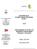 Pre-Feasibility Study Report of the potential hydropower project at the Border site in Ethiopia, carried out as part of Module 5 (Pre-Feasibility Studies of Three Proposed Hydropower Project Sites) of Phase I of the Eastern Nile Power Trade Program Study, implemented by ENTRO from 2006 – 2008. The main topics considered include: a review of previous studies, general hydrology, flood studies, sediment analysis, reservoir and power simulation (using RAPSO model), effects of the dams downstream, geology (rock outcrops around the dam site and its vicinity, geomorphology, discontinuities/fractures/joints, seismic hazards, and other essential geotechnical evaluations), proposed design of the dams and power station (the dam, spillway, intake structures, penstocks, power house, tailrace, switchyard, etc.), electro-mechanical equipment (turbines, generators, transformers), transmission system, access road bridges, cost estimates, construction program, environmental impacts, CO2 emission savings, economic and financial analysis.